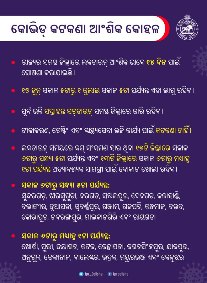 ୧୭ ଜୁନରୁ ୧ ଜୁଲାଇ ଯାଏଁ ଆଂଶିକ ଲକଡାଉନ ରହିବ ବୋଲି ଘୋଷଣା କରିଛନ୍ତି ଓଡିଶା ସରକାର